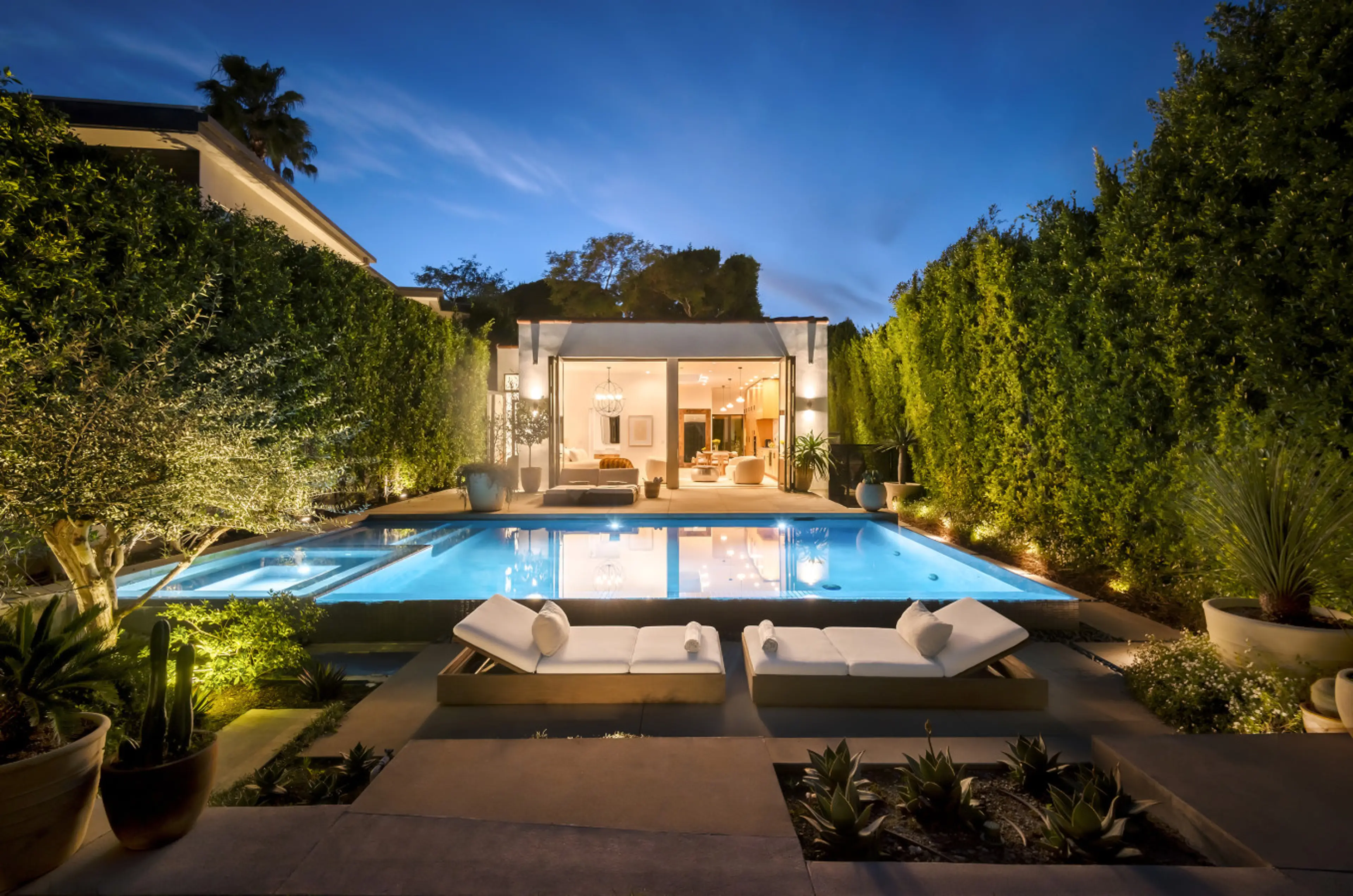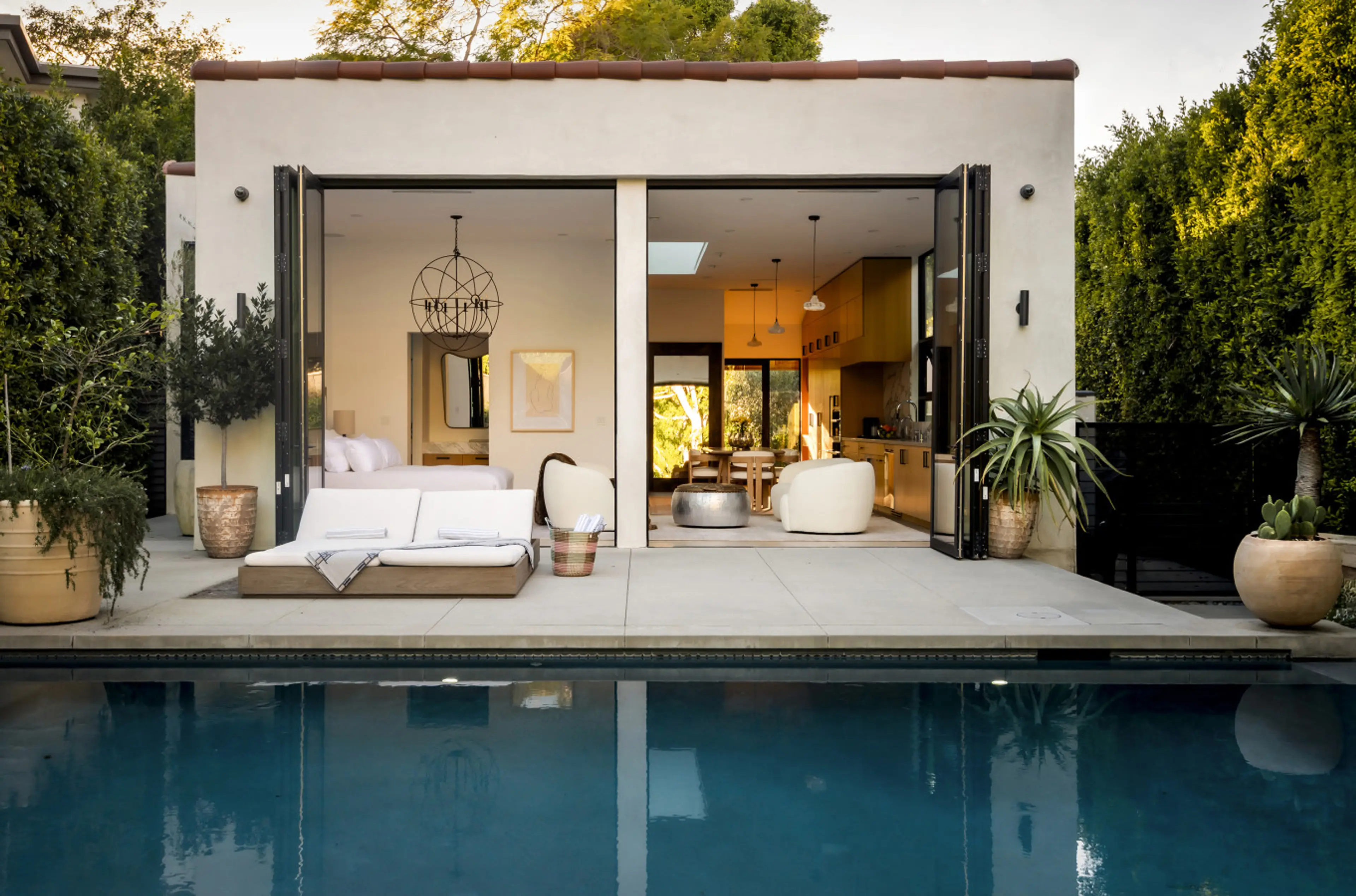 A custom-built residence in the heart of West Hollywood, steps from Melrose Place and the design district. This open-concept one-bedroom home features designer furnishings throughout, floor-to-ceiling pocket doors, and a private pool rarely found in this neighborhood. Olive trees and mature landscap...